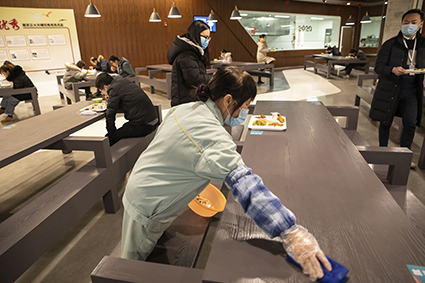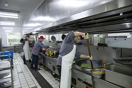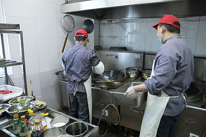 防疫為先,一專多能。食堂既是防疫的重點,更是防疫的難點!一旦出現(xiàn)問題后果將不堪設想。對此食堂每位員工以高度的責任感,多角色無縫轉換嚴防死守。他們一專多能,既是廚師,又是安全員;既是防疫監(jiān)督員,又是衛(wèi)生消毒員。他們通過“自助餐”改“分餐”,降低交叉風險!通過“分時段、定點分散就餐”,嚴控人員聚集!通過高頻次消殺作業(yè),確保防疫衛(wèi)生!通過提供自助消毒酒精與一次性手套,提高員工自我防護!在食堂這一高風險區(qū)域織就了一道安全、牢固的防疫網(wǎng)。
